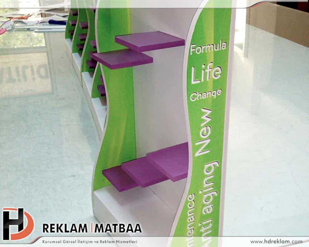 Askı stand duvara yada bir rafa yada bir tezgaha monte edilebilir. Tasarıma göre ışıklı veya ışıksız üretilebilir aynı zamanda asalak tarzında da olabilir.Masa Üstü Standı;